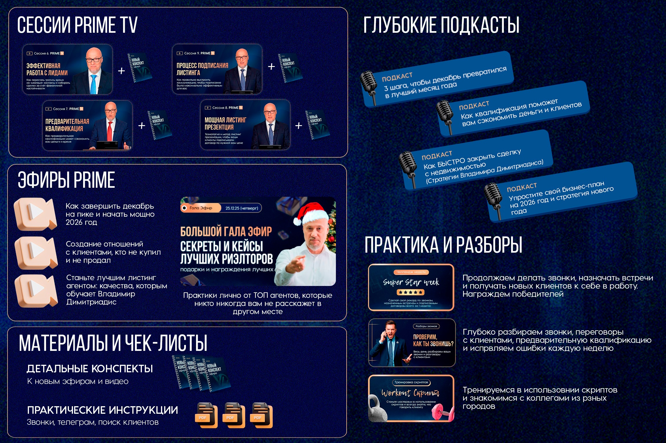 Здесь каждый месяц вы получаете четкий план действий, слушаете подкаст или смотрите новое видео на Prime TV и сразу внедряете со своими клиентам.